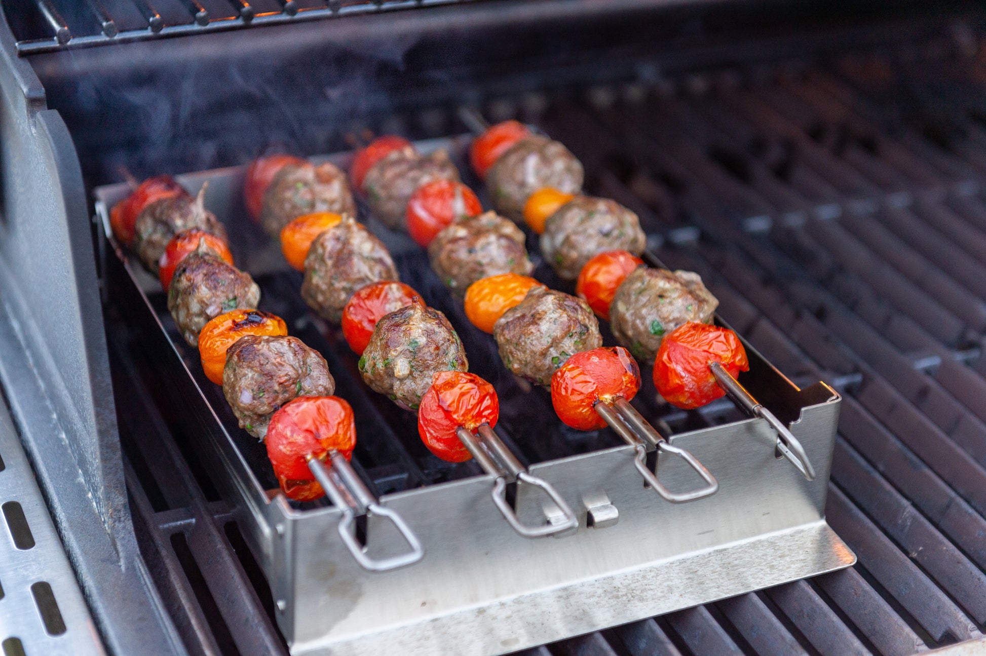 Ce support de brochettes peu encombrant n’occupe qu’un segment de gril standard, et peut supporter 4 brochettes à double broche dans deux positions. Déposer les brochettes à plat sur la grille pour les éloigner de la chaleur, ou les placer verticalement pour les rapprocher de la surface de cuisson. Acier inoxydable facile à nettoyer. Jeu de 4 brochettes de 12 po / 30,5 cm.
