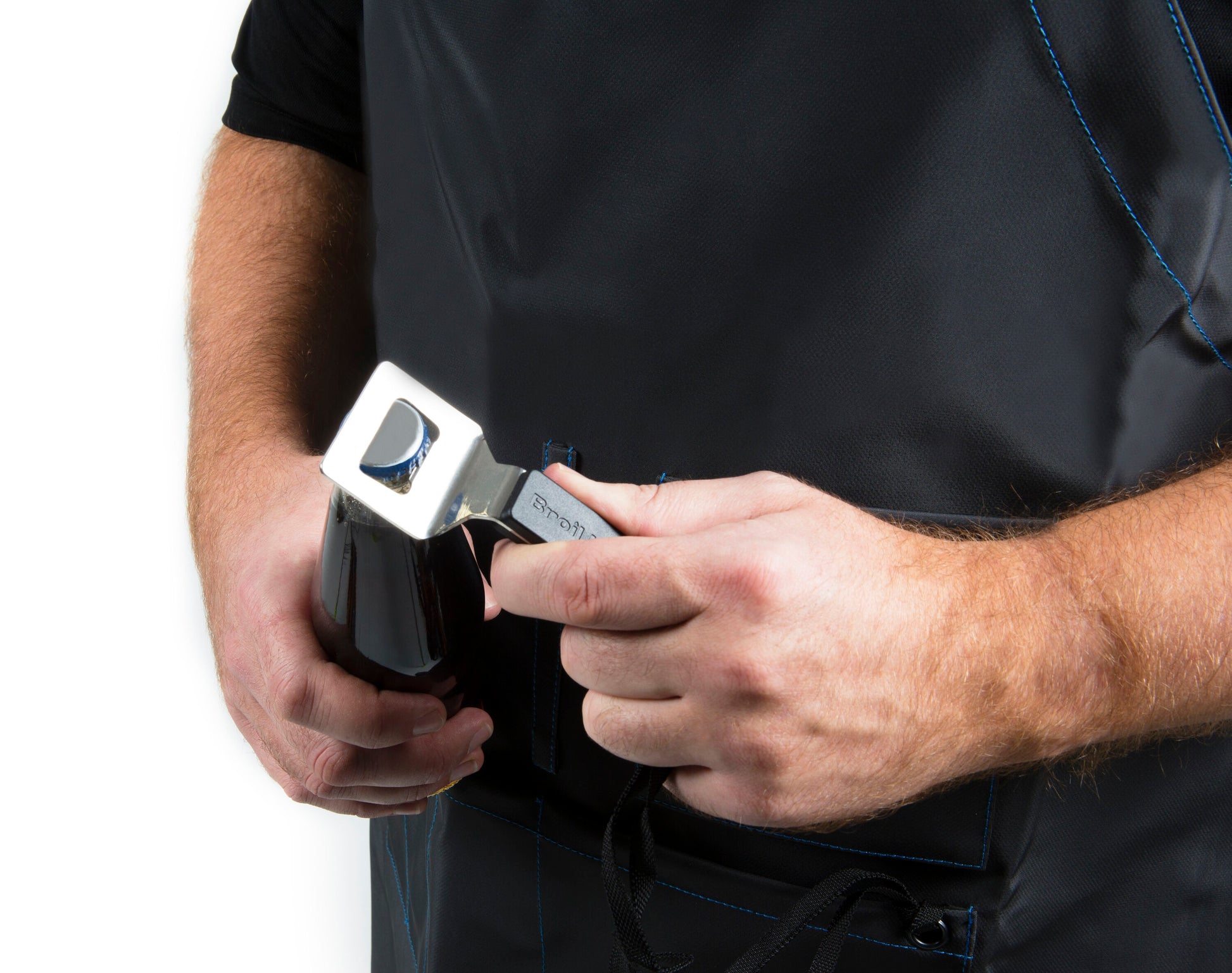 Crafted of the same water resistant material as Broil King Professional grill covers, this apron offers protection from grease and sauces and is easy to wipe clean. Integrated bottle opener, pockets for a thermometer, drink and multiple utensils. Adjustable neck strap with buckle mechanism.