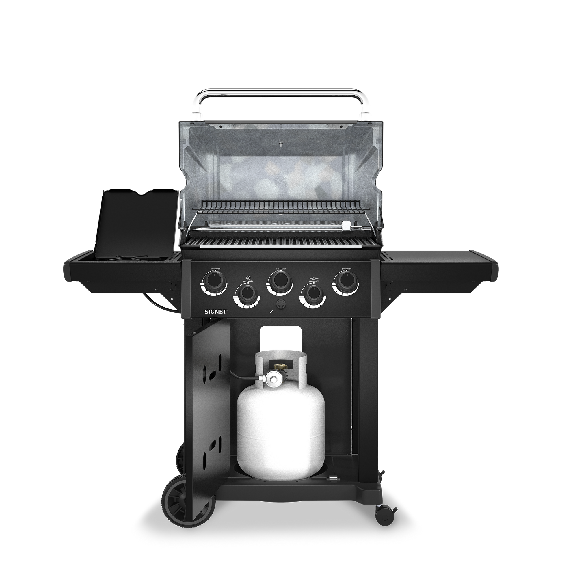 A household favourite for many, the Canadian made Signet 390 from Broil King is a 3 burner, 40,000 BTU grill that features a 635 sq. in. cooking surface, a 15,000 BTU rear rotisserie burner, and a 10,000 BTU side burner equipped with a cooking system designed to maximize flavour consisting of reversible cast iron cooking grids, the stainless steel Flav-R-Wave, stainless steel Dual-Tube burners, Linear-Flow valves maximizing heat control, and a thick, deep cast aluminum cookbox to provide superior heat retention and convection. Experience the advantages of reversible cooking grids designed with a pointed edge to sear and a reversed grooved side to retain moisture and baste food for exceptional barbecue flavour. Additional features include the Sure-Lite ignition system, Accu-Temp lid thermometer. Backed by a limited lifetime warranty on the cookbox, 10 years on the burners, and 2 years on remaining parts and paint.