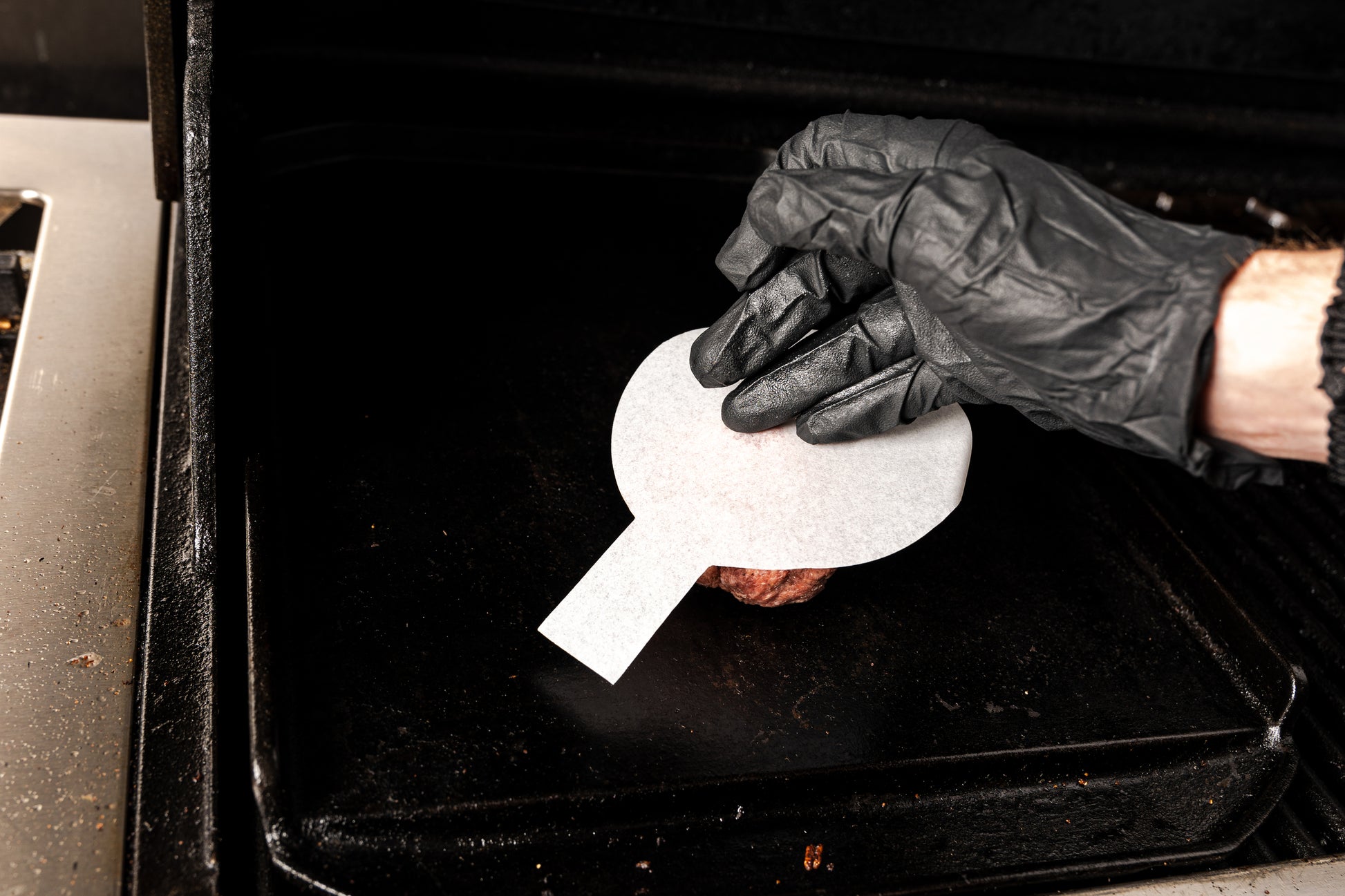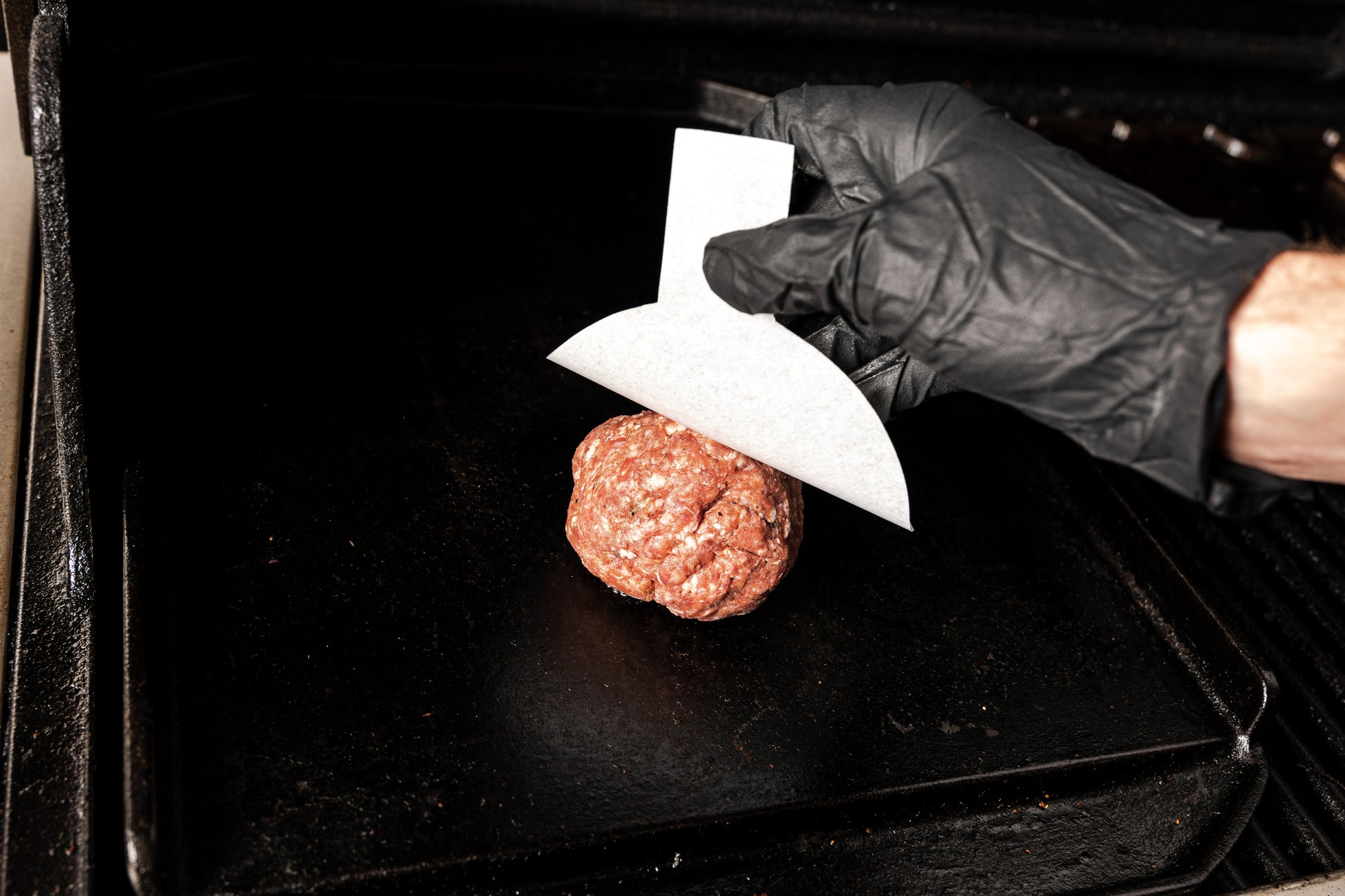 • Smashes burgers to consistent height for even cooking.